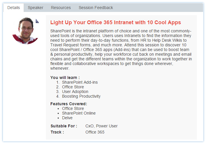 Description: SharePoint is the intranet platform of choice and one of the most commonly-used tools of organizations. Users uses Intranets to find the information they need to perform their day-to-day functions, from HR to Help Desk Wikis to Travel Request forms, and much more. Attend this session to discover 10 cool SharePoint / Office 365 apps (Add-ins) that can be used to boost team & personal productivity, help your workforce cut back on meetings and email chains and get the different teams within the organization to work together in flexible and collaborative workspaces to get things done wherever, whenever.