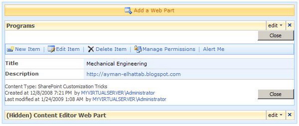 remendous, we managed to hide “New Item” and “Alert Me”.What about renaming “Edit Item” to “Edit Program” and Removing “Delete Item” but leaving the small image (x)? That is what I’m going to cover in trick#4 in the next part!