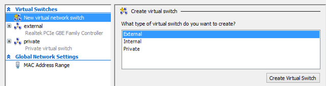 In my case I’m using Windows 8.1 with Hyper-V enabled. To enable Hyper-V on Windows 8/8.1, you can follow the instructions in this article.You will also need to create two Virtual Network Switches (Private & External) in Hyper-V as shown in the figure below :imageWe’ll connect our Virtual Machines to both switches in the next posts.Note: You can use other Virtualization Technologies (VMWare, Oracle VirtualBox, etc…) if you would like to.