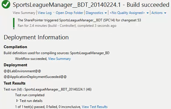 Unfortunately, There is no option out-of-the-box to automatically update the “Build in use” field to use the latest build. This means that after the SharePoint App is built, packaged, deployed & trusted, you still need to pause the testing efforts, go to Microsoft Test Manager and update this field manually to use the latest build. In case you want to add Automated Build Verification Tests (BVT) to your build definition, you will need to find a way to automate this task and that’s exactly what we are aiming for; a fully automated continuous deployment and quality assurance process.