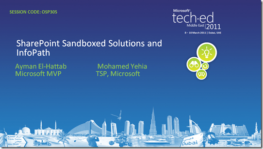 As per the requests I received after my sessions at Microsoft TechEd Middle East 2011, I’ll be posting the slide decks of my sessions here along with some photos (I know I know, you might not be interested in this)