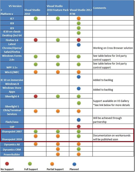 Visual Studio 2010 partially supported Coded UI Testing for SharePoint while Visual Studio 2012 was pretty close to fully supporting this but there were a few SharePoint specific issues that the product team wasn’t able to address that made CodedUI (functional testing) not work well for SharePoint. In Visual Studio 2012 Update 1, those issues were addressed and now Coded UI Testing is fully supported for SharePoint 2010.