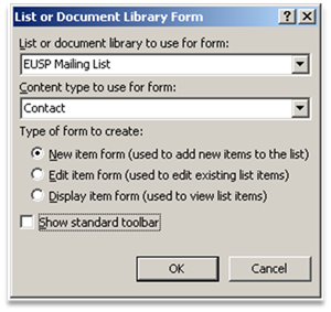 As you can see, we do not need this toolbar in our subscription form so do not check the show standard toolbar checkbox.