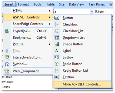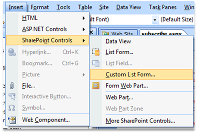 2. On the Insert menu, point to SharePoint Controls, and then click Custom List Form.