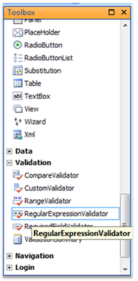6.3. Now drop a RegularExpressionValidator control from the asp.net controls toolbox beside the E-mail address text box as shown beneath.