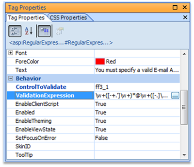 6.4. Specify the RegularExpressionValidator control properties (such as ControlToValidate, ErrorMessage, Validate Expression) from the Tag Properties toolbar.