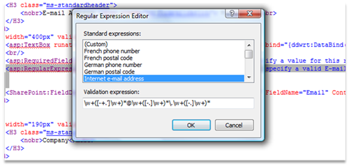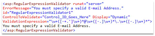 For ControlToValidate, choose the ID of the E-mail address field and for the ValidationExpression, choose Internet E-mail Address.