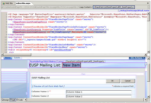 4. Now, the custom list form (Data Form Web Part) has been added to your subscription form. The custom list form shows the default fields for the selected form type, along with any default controls for each field. You can utilize the WYSIWYG tools in SharePoint Designer to add or eliminate columns, modify font formatting, or apply colors. When you do this, Extensible Stylesheet Language (XSL) is directly inserted into the HTML. Although it is possible to amend the XSL directly in Code view, you can make use of the formatting tools in Design view to apply XSL without studying any XSL.
