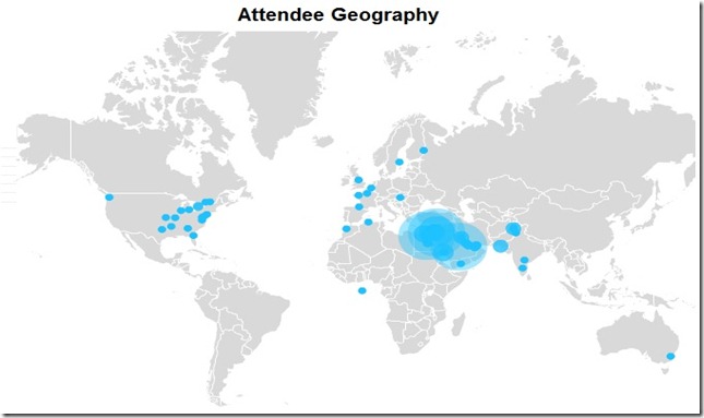 Each session lasted from 45 to 55 minutes followed by a Q & A session. All of the speakers were well versed in their topics and inspired a lot of questions from attendees. I was only able to attend 8 of the 16 sessions. The set up was really nicely done with two LiveMeeting Channels set up (one for the Arabic sessions and the other for the English sessions) this was used for the slide presentations and audio from the session speakers; along with an online chat room sponsored by endusersharepoint.com for questions from the attendee’s. The sessions started and ended pretty close to on time and everything was done really well.”, By : Johnathan