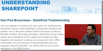 Just a quick note to let you know that a new free bonus issue of “Understanding SharePoint Journal” was released a couple of hours ago. The issue is titled “SharePoint Troubleshooting” and is written by me.
